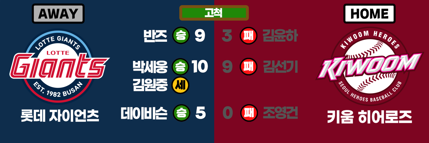 롯데 선발은 우완 박세웅, 키움 선발은 우완 김선기