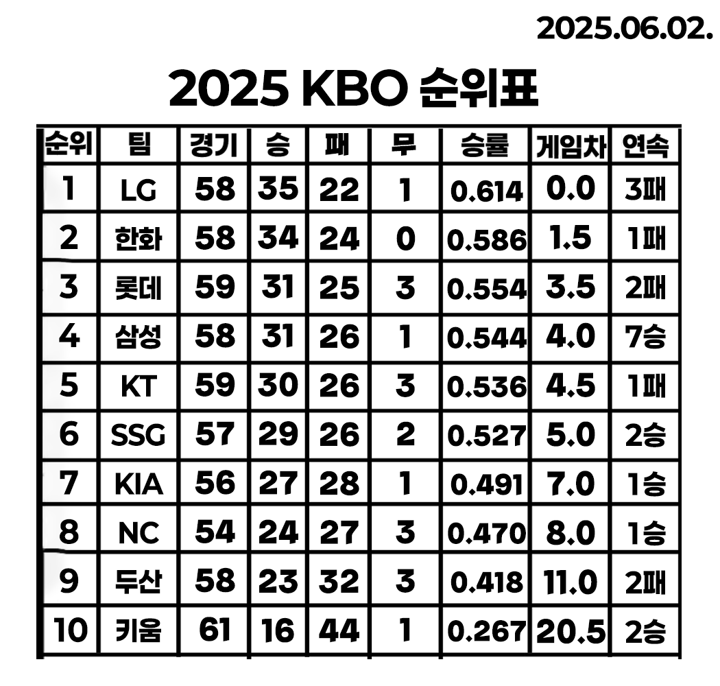 25' KBO 11주 차는 5월 27일(화) ~ 6월 1일(일)까지 진행되었습니다.